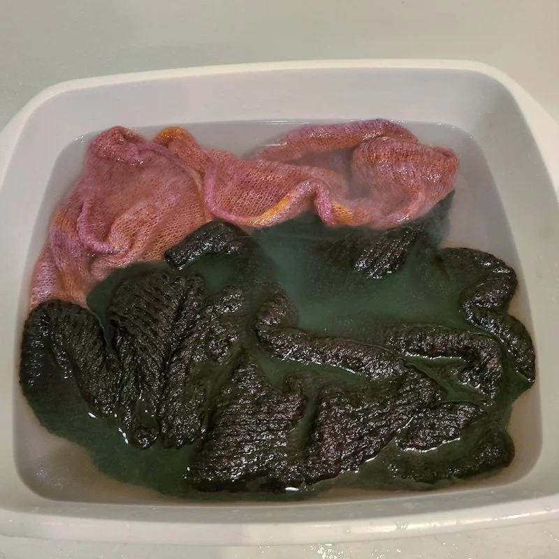 If you are a lot further from the end of your knitting project than I was or just can’t stand the smell after trying other strategies, you can still wash an in progress knitting project. However, you should slip it on to a long piece of waste yarn before you do so – knitting needles aren’t designed to soak underwater and they could rust or discolor onto your knitting in ways you aren’t expecting.