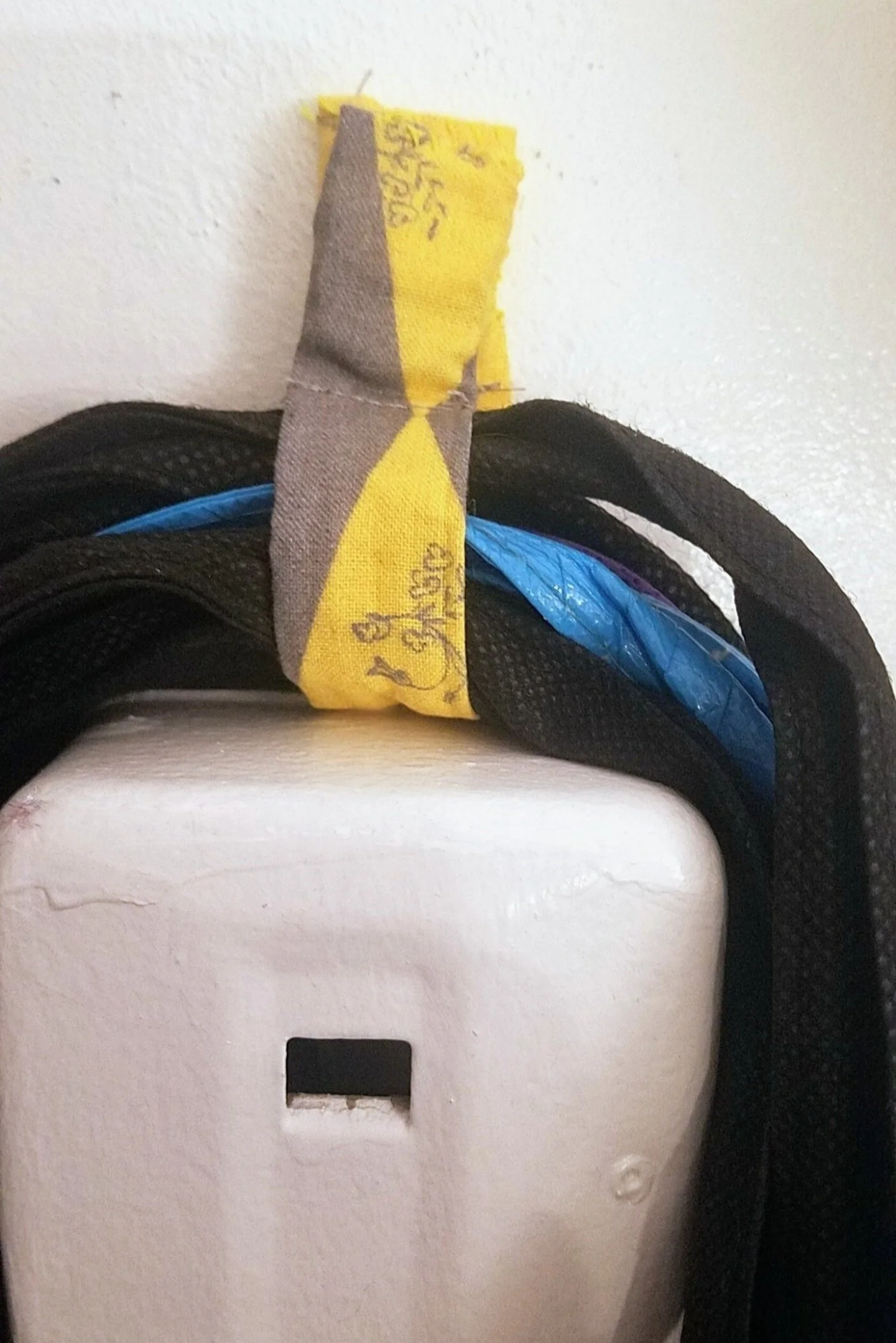 Got a metal door or cabinet and some scrap fabric? Make a quick strap to tidy up all those tote bags.