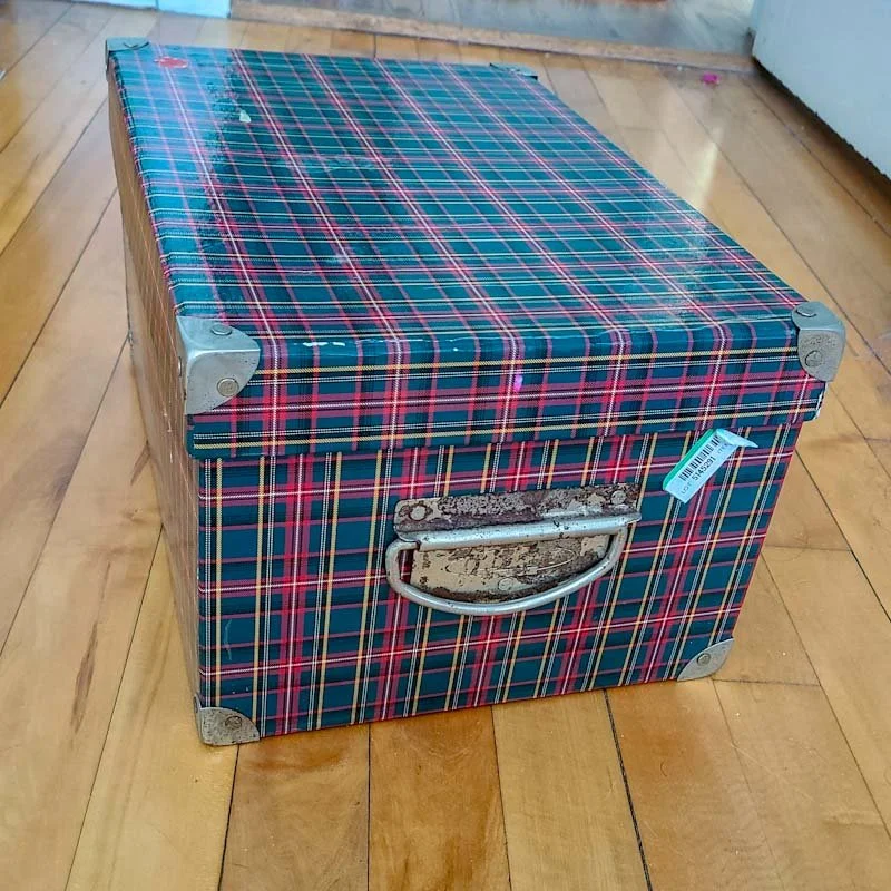 This box originally held a Christmas gift for one of my brothers back around 1998 or 1999. I can roughly pinpoint the year because when I went back to college after Christmas, I used the box to safely transport my own Christmas gifts back to my dorm (I lived three hours’ drive from my undergraduate college so the box needed to be sturdy, but not air travel sturdy). From then on, the box became storage for any number of small items for which I needed easily accessible, closeable storage, following me from college to New York and finally to my current home in Chicago. For many years the box lived in a series of tiny apartment bathrooms to provide extra storage, which is why the metal corners and handles are now a bit rusty; over the last five years or so it has moved into my primary crafting space and become the storage for my Spoonflower shop test samples, including the color map I use to make sure the colors of my designs will print the way I want them to on actual fabric. So not only do I still use it regularly, it could really use an aesthetic makeover. Perfect.