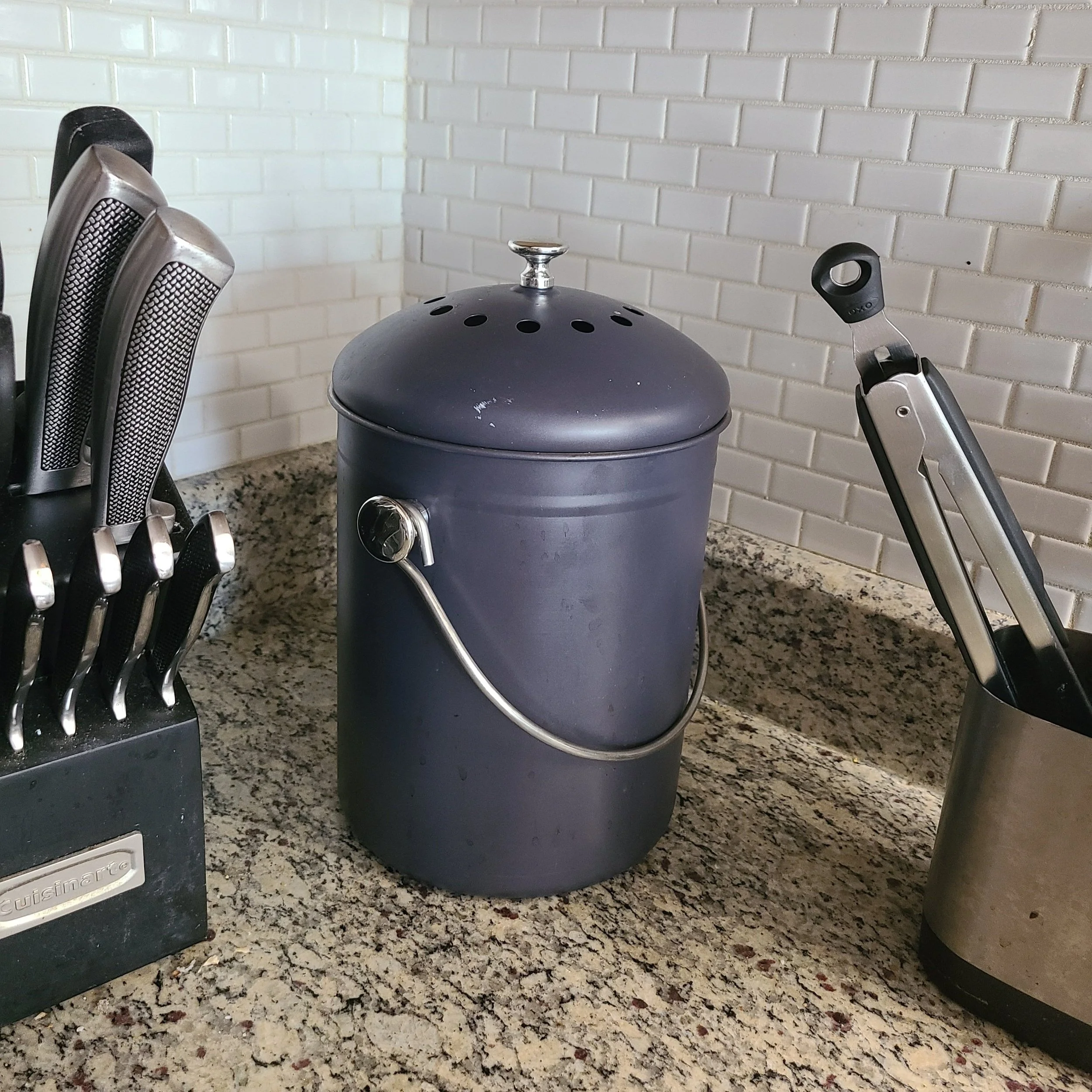 At the same time, I also purchased a countertop compost pail to collect kitchen scraps. I can’t find the exact one I purchased but it is a stainless steel pail, with two carbon filters in the lid to help control odors and there are many versions of this type of pail out there. Our current kitchen countertop has a corner between the sink and our cutting board that was a perfect place to put it, right at hand if one of us has been chopping vegetables or if I’m cleaning out my French press and need to dump the coffee grounds.