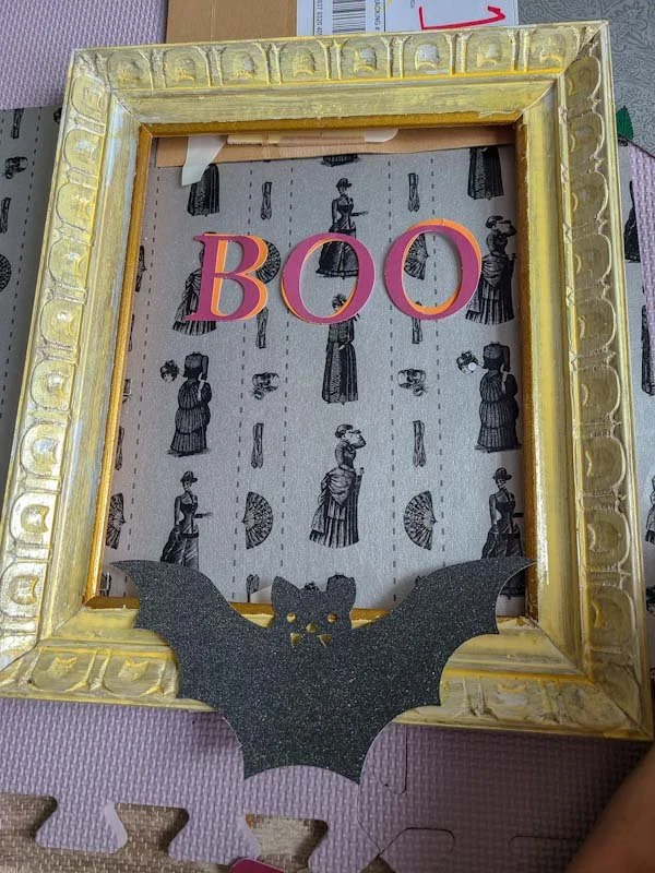 As I was cutting the wallpaper out, I realized I had plenty left to cut an additional rectangle, and remembered that the door I was planning to place this on has a full glass pane, which means we’d see the back of the frame regularly – and if you recall the original back of the frame was actually missing and had been replaced with a random piece of cardboard from some old packaging. So I decided to cut another piece of wallpaper and glue my last remaining glitter bat to the back so that we’d get to enjoy the décor even from the backside of the door.