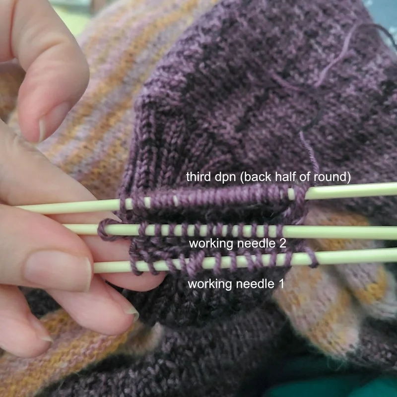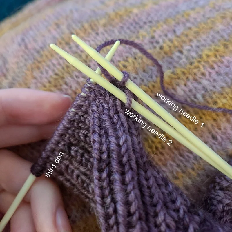 6. Distribute the back half of the stitches from the third dpn to the two working dpns, again slipping the knit sts to the front and the purl sts to the back needle (the stitches from step 5 will be the stitches furthest to the right once all the stitches are distributed). The third dpn rotates around to become your left hand needle, and the two working needles are in your right hand. Slip all the sts off the third needle and set it aside.