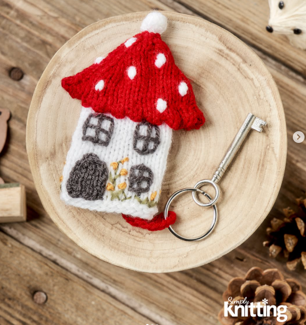Mushroom House Key Fob by Jane Burns, Simply Knitting Magazine, 1st edit (Instagram link)